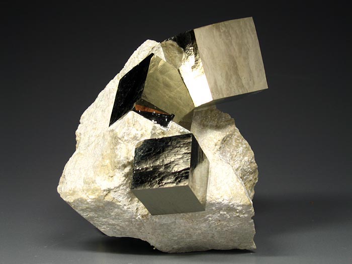 Wunderschöne vollkommen natürlich entstandene Pyritsstufen. Die perfekte Würfelform spiegelt den atomaren Aufbau des Pyrits wieder, der im Inneren eine kubische Kristallsymmetrie aufweist. Die Pyritwürfel sind natürlich entstanden. Die Flächen wurden nicht geschliffen oder in irgend einer Art bearbeitet! Die Pyritwürfel wurden lediglich aus dem Muttergestein herauspräpariert. |